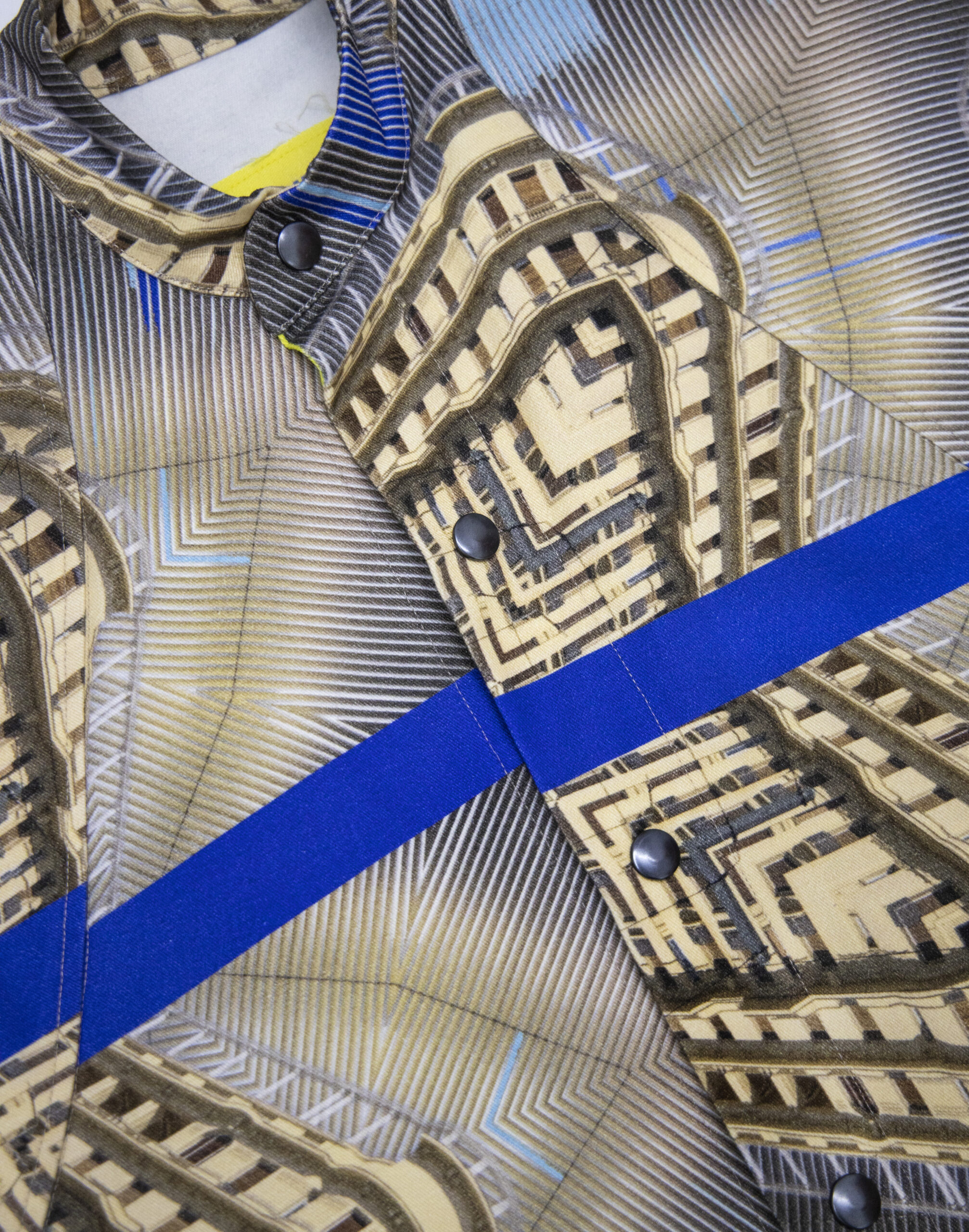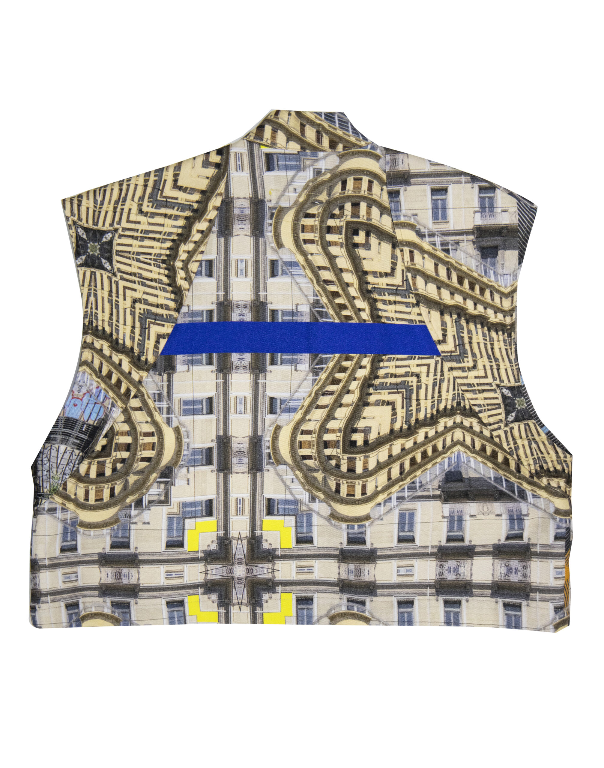 Short oversized vest of Kypseli print, from the collection Kaleidoscope Athena, depicting scenes from old and new Kypseli architecture.